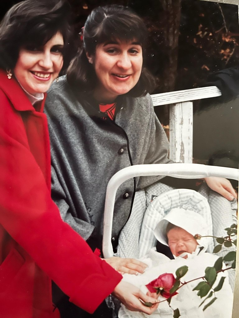 But that was just the beginning—St. Therese made me a firm believer in signs on my daughter’s Christening day. I had asked Kathy to be Alex’s godmother, and the baptism was in late November. Here in the Northeast U.S., my garden was naturally dormant. However, the morning we took Alex out for her Christening ceremony and celebratory party, St. Therese had a sign for us. On the rose bush that Kathy gave us, there was a single, beautiful rose blooming just for Alex’s special day! We couldn’t believe it and took this 29-year-old photo just to prove it!
