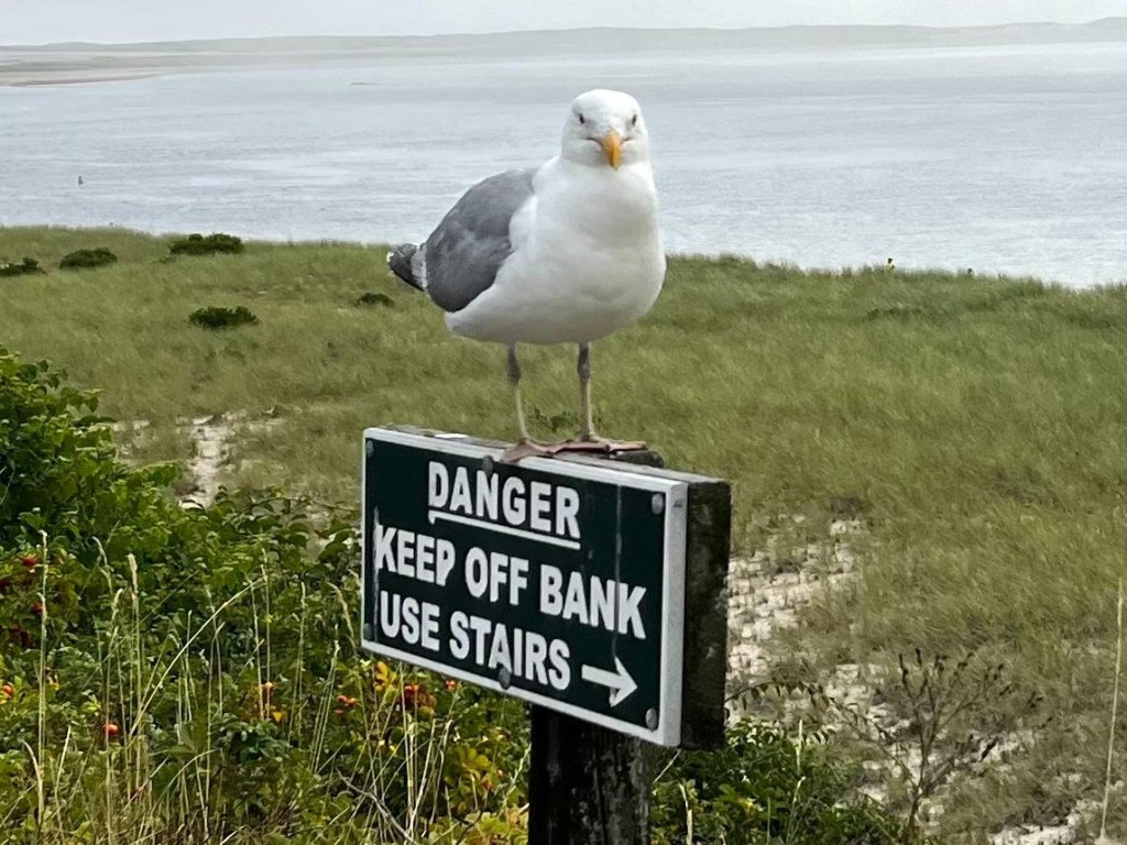 After getting over the shock of realizing it was indeed a seagull who had body-slammed my cheek and jaw and then stole the food out of my mouth mid-bite, I looked on the ground near me and there was a chunk of the muffin still on the sandy soil. Stuck upright in the middle of it was a gull feather, standing proud like a birthday candle! Yuck! Before I could snap a photo of that fine feast for the senses (?!?), the gull swooped back and grabbed that last vestige of my gluten free breakfast! (However, I did get a photo later of that bold bird, atop a “danger” sign on the bluffs. However it should have instead read, “Danger, do NOT even think about eating anything on this bench!”)
